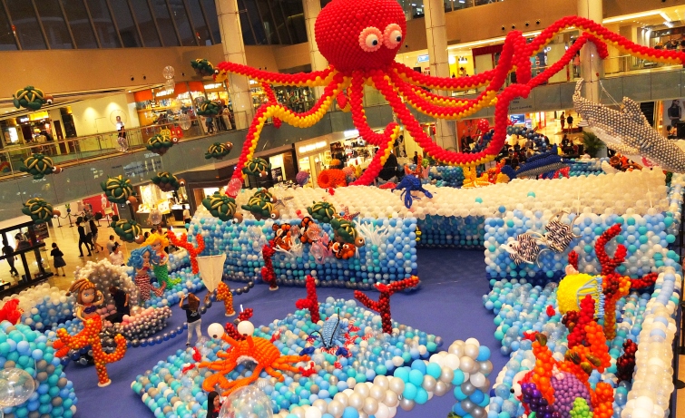 Since 2012, Marina Square has been organising a huge balloon show during the first-term school holidays. Each time between 45,000 balloons to 100,000 balloons filled the 500 sqm events space at the shopping mall, with everything that can stretch a kid’s imagination – a pirate ship, walking dinosaurs, giant robot, lost treasures, cannibals, carnivorous plants, etc. On some days more than 50,000 people thronged the show, all eager to take a selfie. The creative director of the shows is Lily Tan, Singapore’s most renowned balloon artist. Every year, dozens of volunteers offered to help with the creation of these fantastical lands. Every year, the shows achieved Guinness or Singapore records.